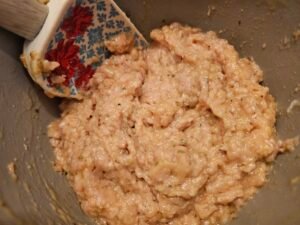 • Mix together ground chicken, eggs, 1/4 cup parmesan, and the seasonings.