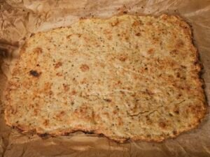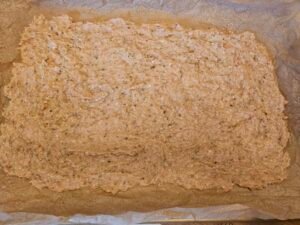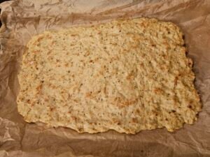 • On a parchment paper lined baking sheet flatten your mixture in a thin layer. The thinner, the crispier it is. Like I showed in the chicken chip video linked above.