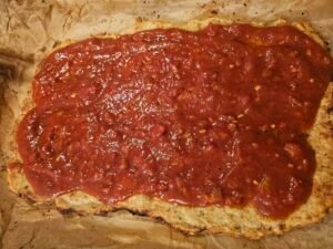 1. Remove the baked chicken base from the oven and spread with marinara sauce.