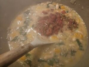 - Add the kale, canned and rinsed beans, and fire roasted tomatoes.