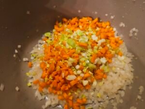 Stir in the carrots and celery, cooking for about 5 minutes to soften.