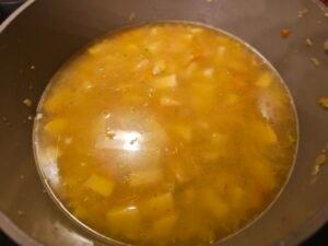 Add the chopped potatoes and chicken broth. Simmer until the potatoes are tender.