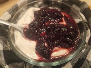 I cooked some frozen cherries with a little water. Mashed them and added almond extract. I also chopped up a little, max 2 tablespoons of dark chocolate and added it.