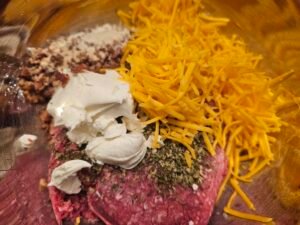 - In a large bowl, gently combine ground beef, cheddar, bacon, cream cheese, ranch, garlic powder, salt, and pepper.