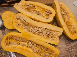 • Cut the squash in half lengthwise and deseed them.