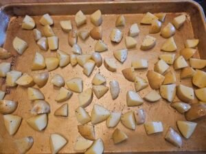 Place the bite‑sized golden potato pieces on a large sheet pan.