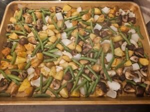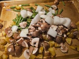 Add the green beans, quartered mushrooms, onion pieces, and any extra veggies to the sheet pan with the potatoes.