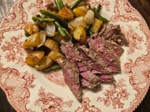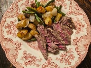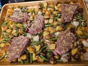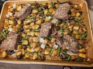 You can prep by cutting the potatoes, steak, and veggies in advance and storing them in the fridge. When you’re ready to cook, follow the baking steps as written. Leftovers also reheat well in the oven or air fryer.
