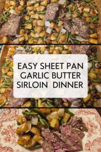 This sheet pan butter garlic sirloin has quickly become one of my family’s favorite steak dinners. It’s everything we love in a classic meat‑and‑potatoes meal—tender sirloin, golden potatoes, and roasted veggies—finished with rich garlic butter and steak seasoning, all cooked together on a single pan.